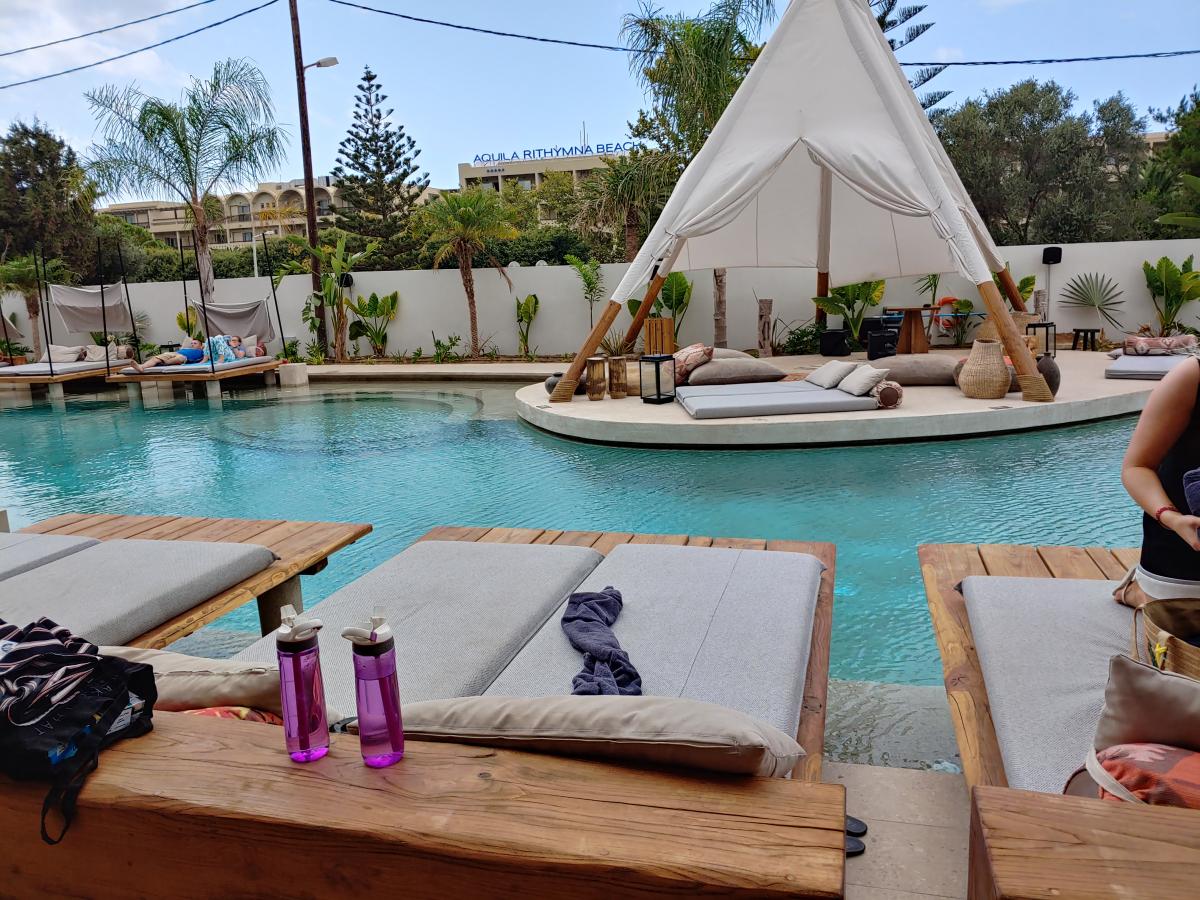Unser Hotel bekommt 4,5 von 5 Sternen. Alles super, sauber, aufmerksames und sehr freundliches Personal. Die Leute, die sich über kleinste Verputzungsfehlerchen oder darüber dass es nur 8 deutsche TV-Kanäle gibt, aufregen, haben den Schuss nicht gehört. Es ist alles tiptop. Essen auch wirklich komplett in Ordnung, immer alles frisch und lecker, die Getränke (für All-In sehr viele “echte” und gute Marken) sind keinen Deut schlechter. Den halben Punkt Abzug gibt es für die musikalische Dauerbeschallung von 10 Uhr morgens bis 0 Uhr nachts und für die Masse an Instagram-Uschis. Strand ebenfalls top aber es ist eben Kretas Nordküste, heißt: Kein Sandstrand, sondern felsiger Untergrund. Strandbar nicht zu schlagen, sehr moderate Preise, wieder sehr nettes Personal. Tag am Strand kostet 3 Euro, dafür bekommt man Liege, Sonnenschirm, Wasser und Melone. Was willste da meckern?